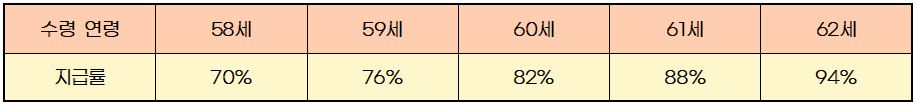 국민연금은 지급시기 전이어도 조기에 받을 수 있습니다. 국민연금을 조기에 받는 시기는 지급 시기로부터 최대 5년 앞당겨서 받을 수 있습니다. 하지만 미리 받는 만큼 감액이 되어서 받게 됩니다. 1년 먼저 받게 될 경우 92%이며, 5년 먼저 받게 될 경우 70%의 지급률입니다. 아래 표처럼 1년에 6%씩의 감액이 있습니다.