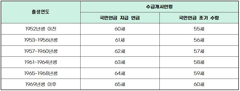국민연금은 지급기간이 10년 이상이 되고, 나이가 충족된다면 지급시기가 올 때 받을 수 있습니다. 출생연도에 따라 국민연금 지급 연령과 조기 수령 연령은 아래와 같습니다. 국민연금 수급 연령은 과거에 비해 계속 증가하는 점을 참고하시기 바랍니다.