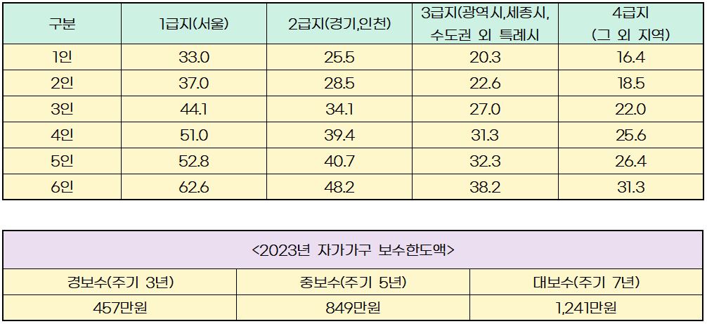 주거급여는 중위소득 47% 이내 가구에 해당하며, 주거급여는 세입자에게 임차비를 지원해 주고 집주인에게는 집수리비를 지원해 줍니다. 지역과 가구수에 따라 지원되는 금액은 아래와 같습니다. 임대인에게는 자가가구 보수한도액을 지원합니다.