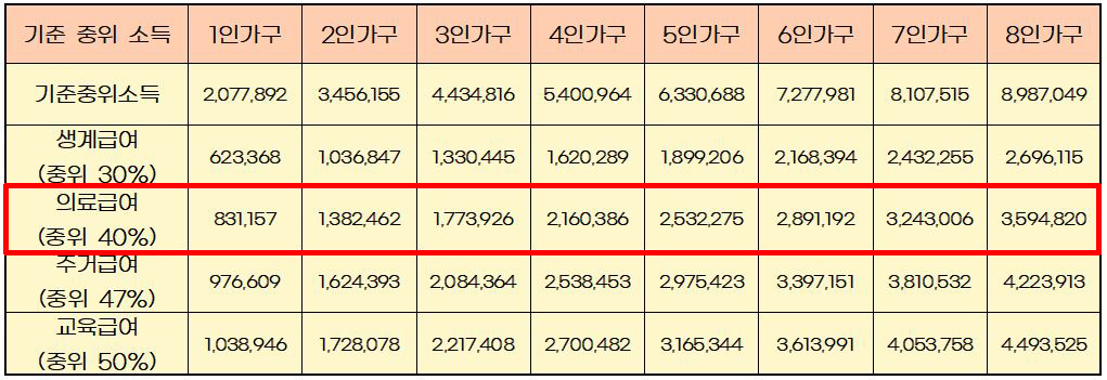 의료급여는 중위소득 40% 이내에 해당하면 대상이 됩니다. 앞서 생계급여와 마찬가지로 가구수에 따라서 기준금액은 달라집니다. 표를 살펴보겠습니다. 기준금액이 생계급여와 차이가 있어서 생계급여 지원대상자가 아니더라도 의료급여에서 대상자가 될 수 있습니다.
