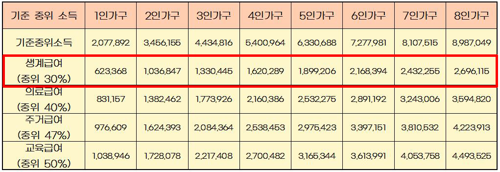 기초생활수급자의 종류로는 생계급여, 의료급여, 주거급여, 교육급여가 있습니다. 이 중 첫 번째로 생계급여에 대해 알아보겠습니다. 생계급여는 2023년 기준 중위소득 30% 이내에 해당이 되면 대상이 됩니다. 가구수에 따라 그 기준금액은 다릅니다.