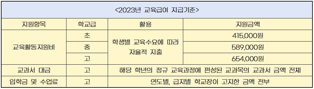 교육급여는 중위소득 50% 이내 가구에 해당됩니다. 학교에 입학, 재학하는 자녀에게 교육활동지원비, 교과서 대금, 입학금 및 수업료 등을 지원합니다. 교육활동비는 연 1회 지급합니다. 지원되는 금액은 아래와 같습니다.